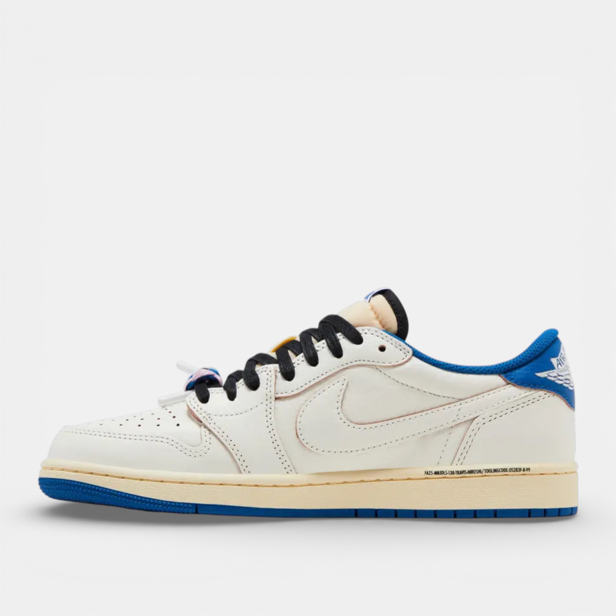 La Air Jordan 1 Retro Low OG SP Fragment x Travis Scott Sail Military Blue réunit trois univers majeurs autour d’une même silhouette : l’héritage Jordan, la culture hip-hop portée par Travis Scott et l’approche minimaliste du streetwear japonais incarnée par Fragment Design. Cette collaboration se distingue par un coloris équilibré mêlant sail, noir, muslin et military blue, à la fois sobre et immédiatement identifiable.