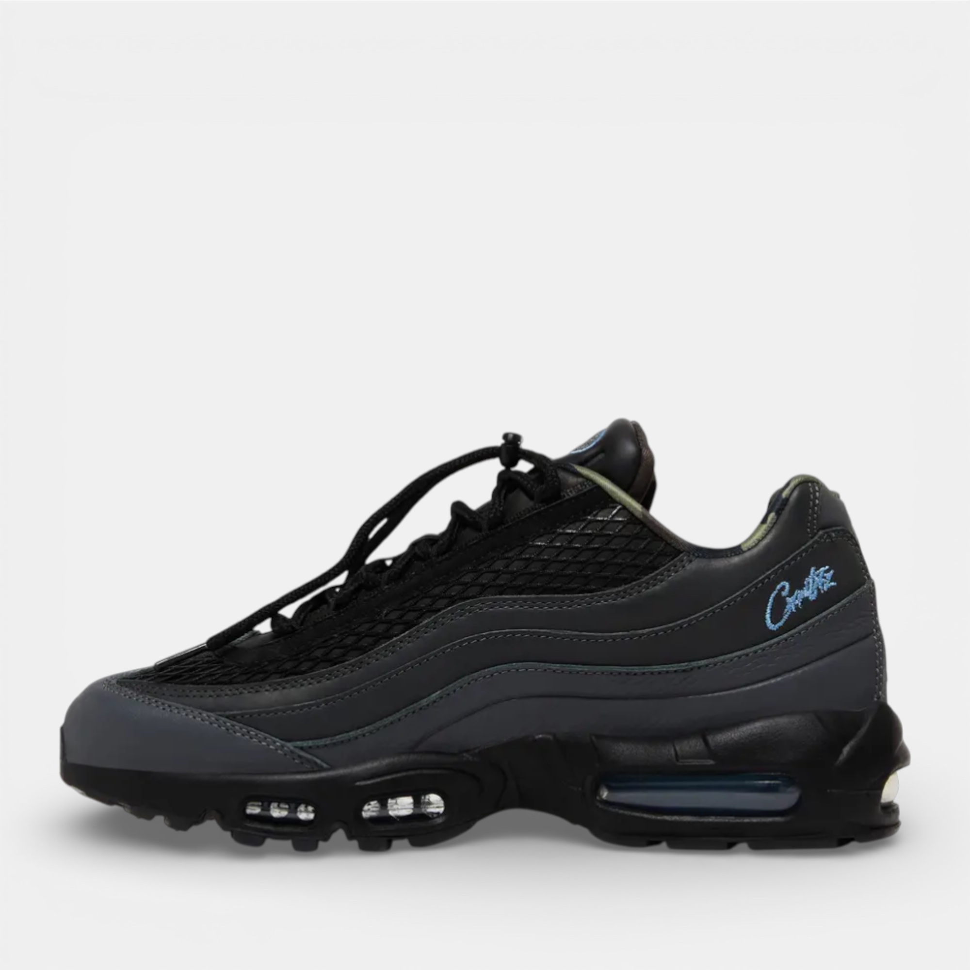 La paire associe un upper en cuir et mesh, avec des empiècements ondulés à finition “Gridiron” qui structurent visuellement la tige. Le mesh noir autour du col contraste avec le mudguard gris clair pour un rendu équilibré et net. Côté détails, Corteiz signe la paire avec plusieurs broderies sur l’avant-pied latéral et le talon de la chaussure gauche, tandis qu’un mini Swoosh bleu clair est brodé sur le talon latéral droit. On retrouve également des éléments camouflage sur la doublure, la semelle intérieure, la languette et le branding talon, ainsi qu’un système de laçage à cordon. L’ensemble repose sur une semelle noire équipée d’unités Max Air visibles au talon et à l’avant-pied.
